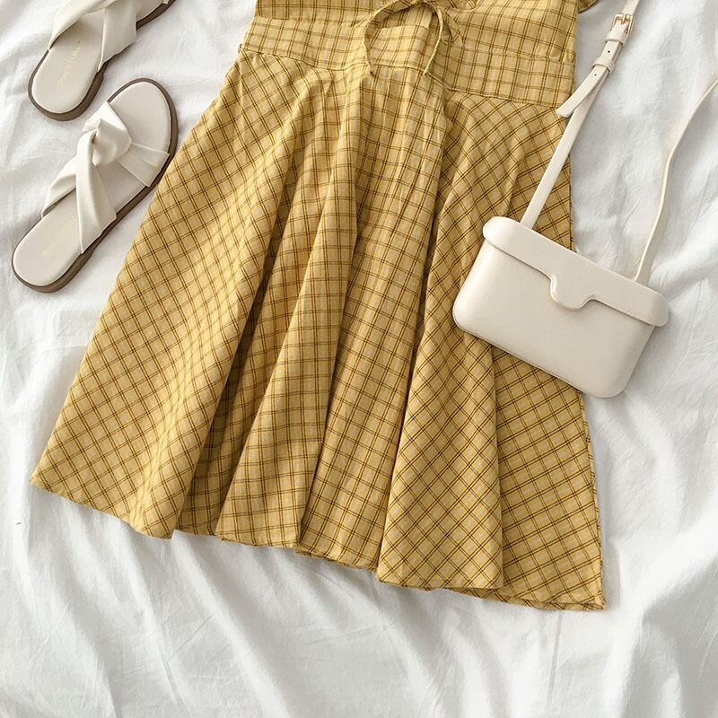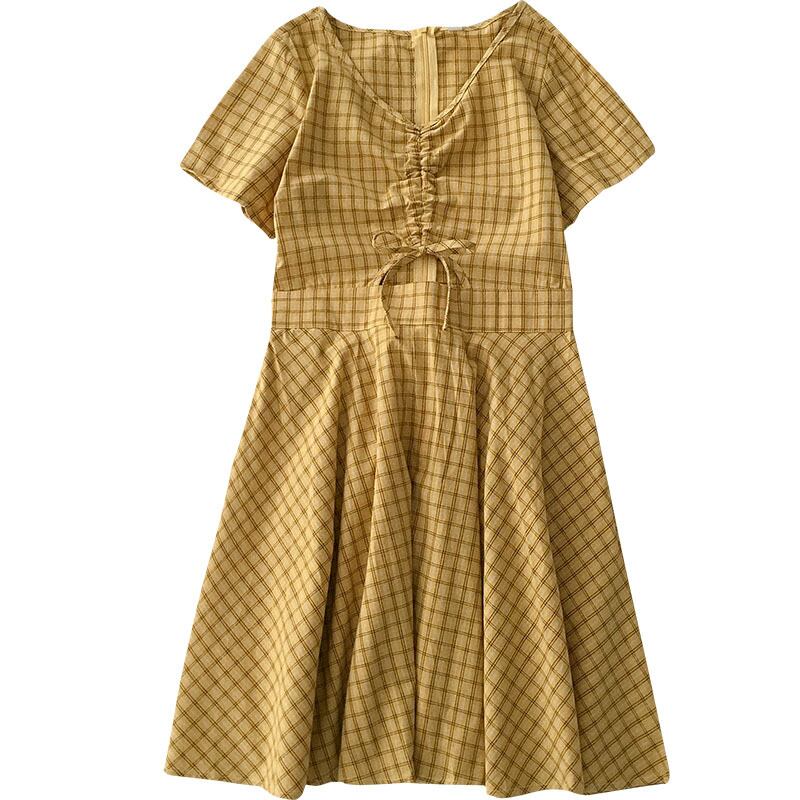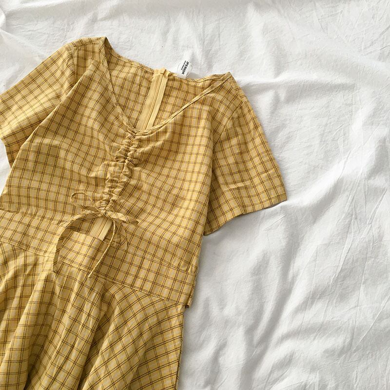 ワンピース ドレス レディースファション 着痩せ 可愛い デート 韓国風 カジュアル Vネック 半袖 ショート丈 フリーサイズ チェック柄 イエロー黄色い 激安