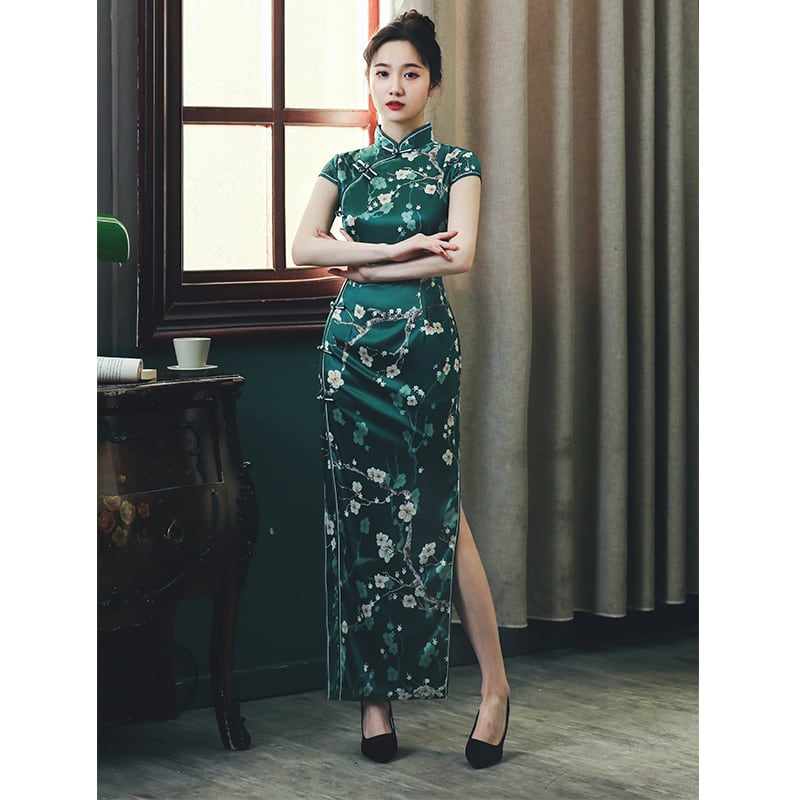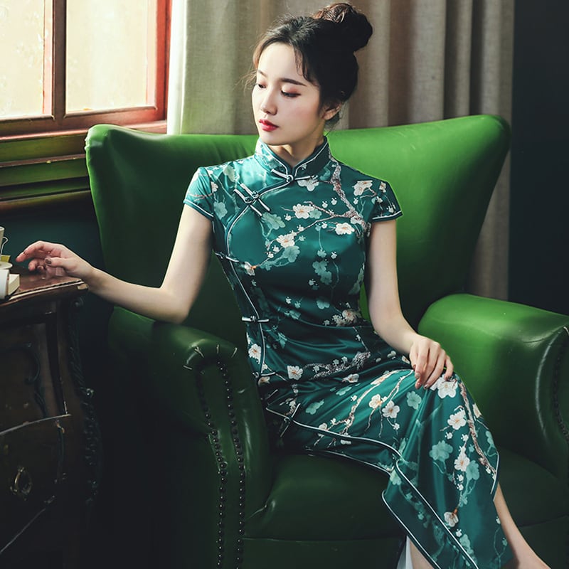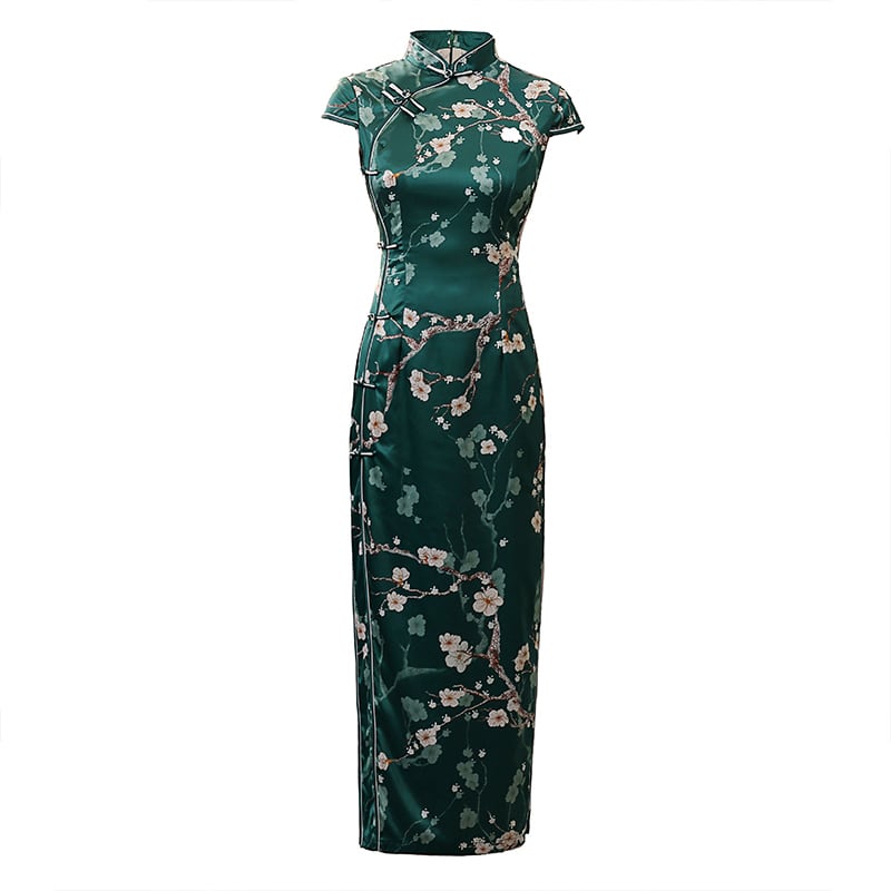 チャイナドレス ドレス チャイナ風服 パーティー 二次会 女子会 スタンドネック 半袖 ロング丈 大きいサイズ S M L LL 3L 4L グリーン 緑 エレガント 綺麗め レトロ