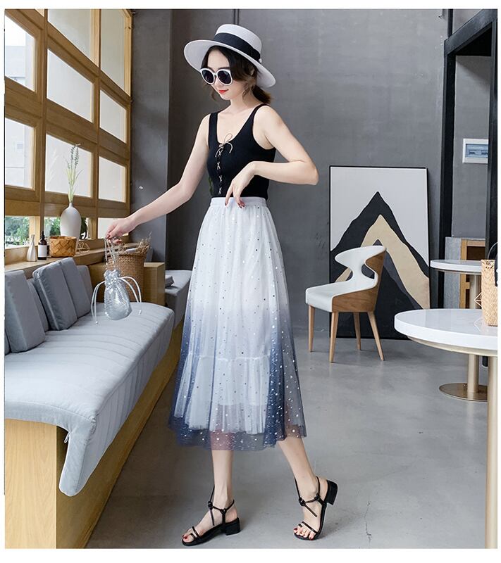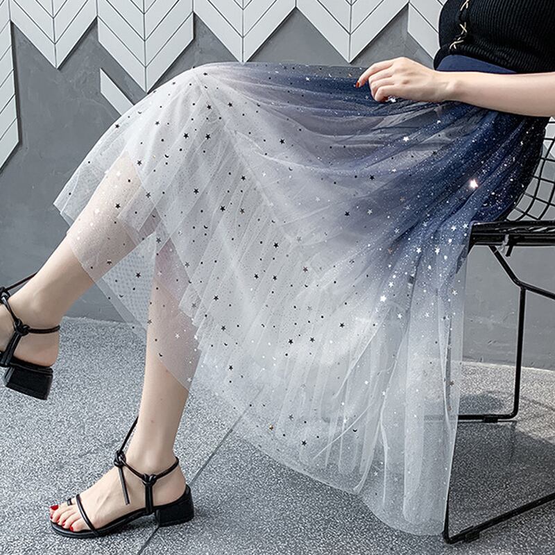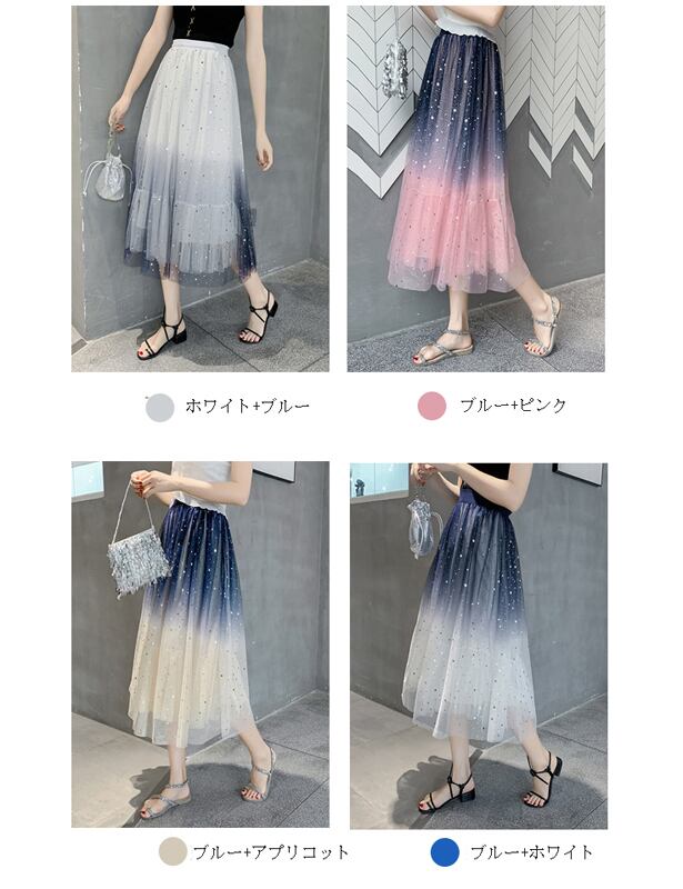 スカート ボトムス チュール ロング丈 プリーツスカート ハイウエスト ウエストゴム レディースファション 可愛い デート 女子会 星空 ホワイト ブルー アプリコット ピンク