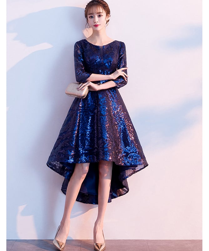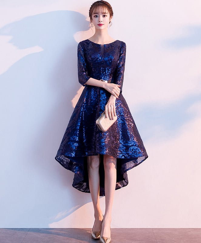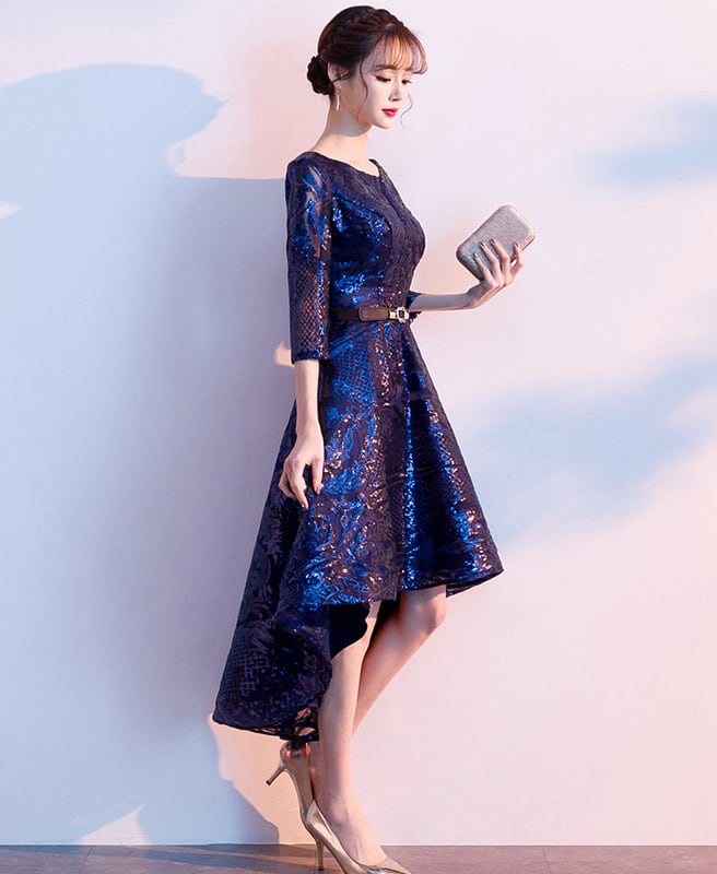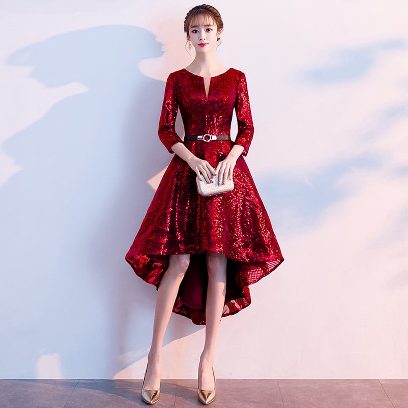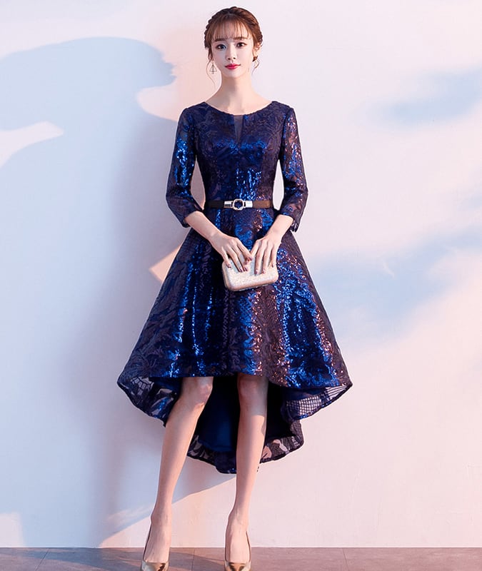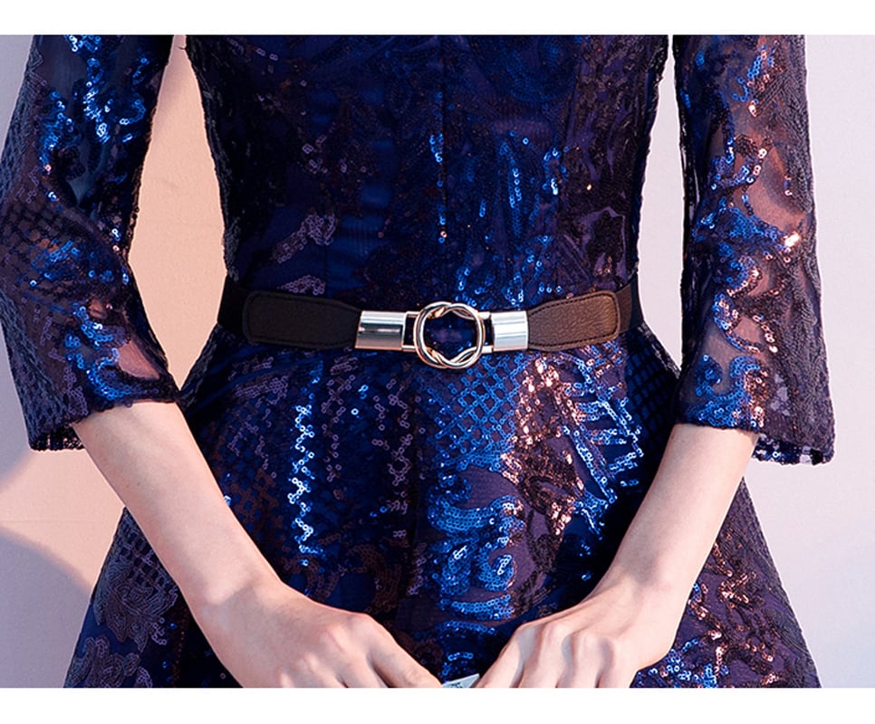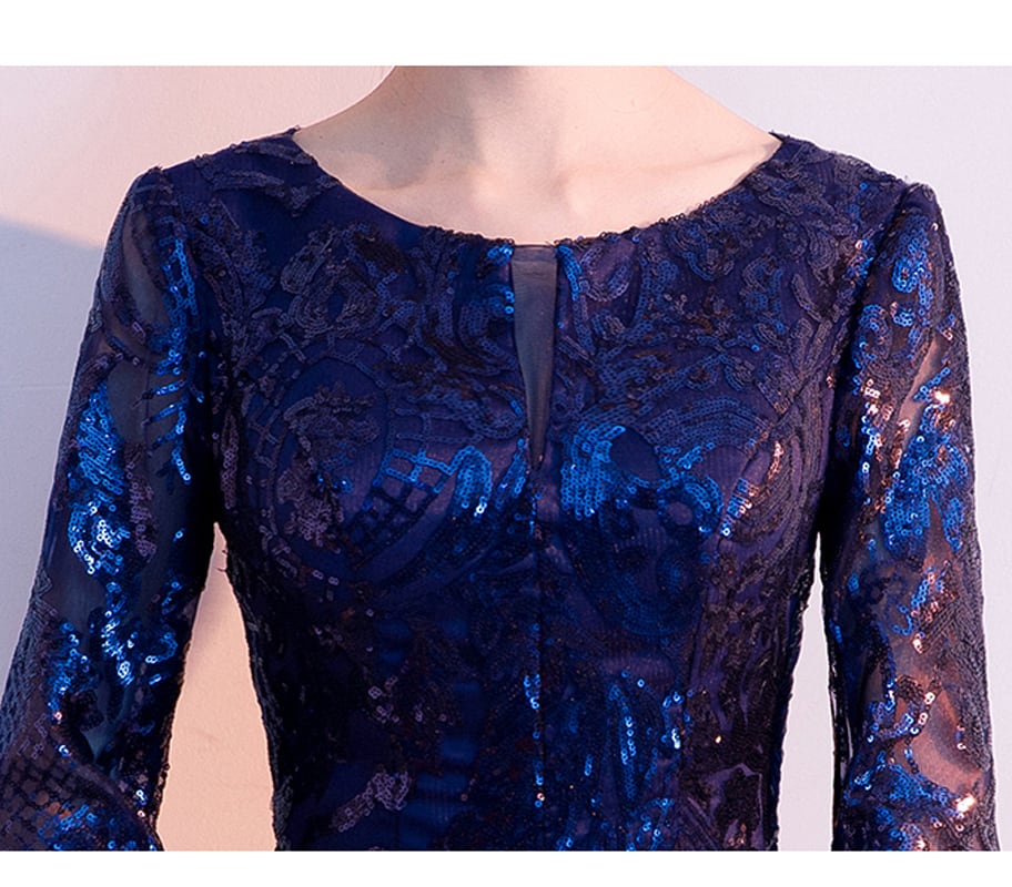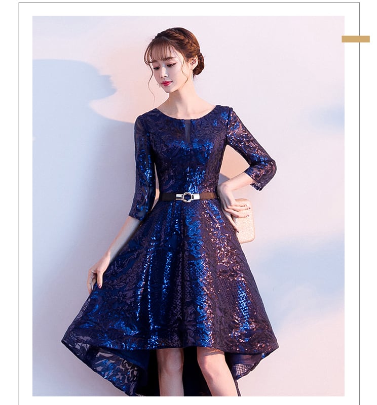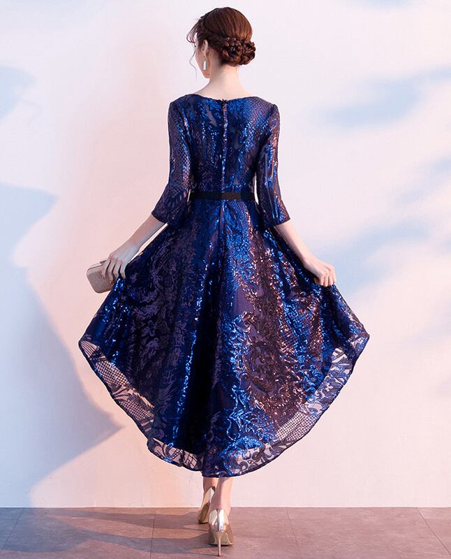 パーティードレス ワンピース ロングドレス アシンメトリー 二次会 結婚式 演奏会 パーティー エレガント ラウンドネック 七分袖 ロング丈 大きいサイズ XS S M L LL 3L 4L キラキラ スパンコール ネイビー レッド