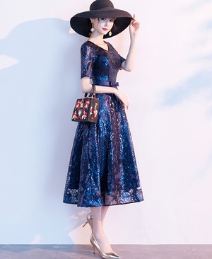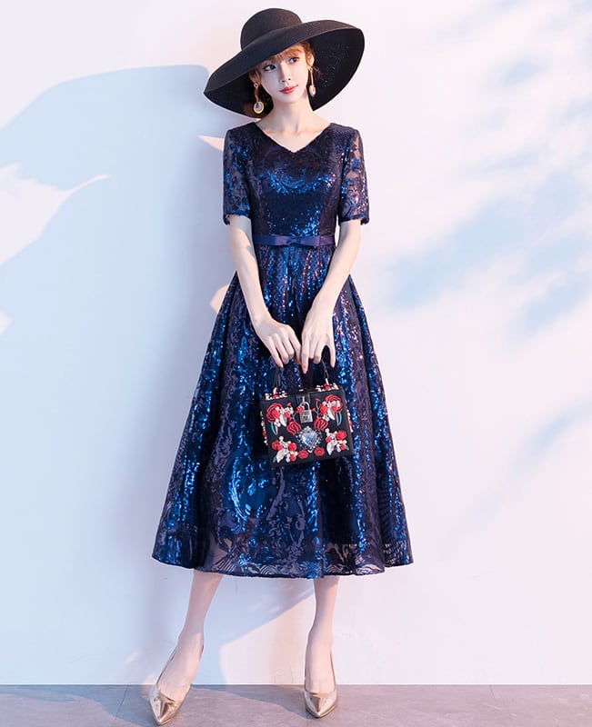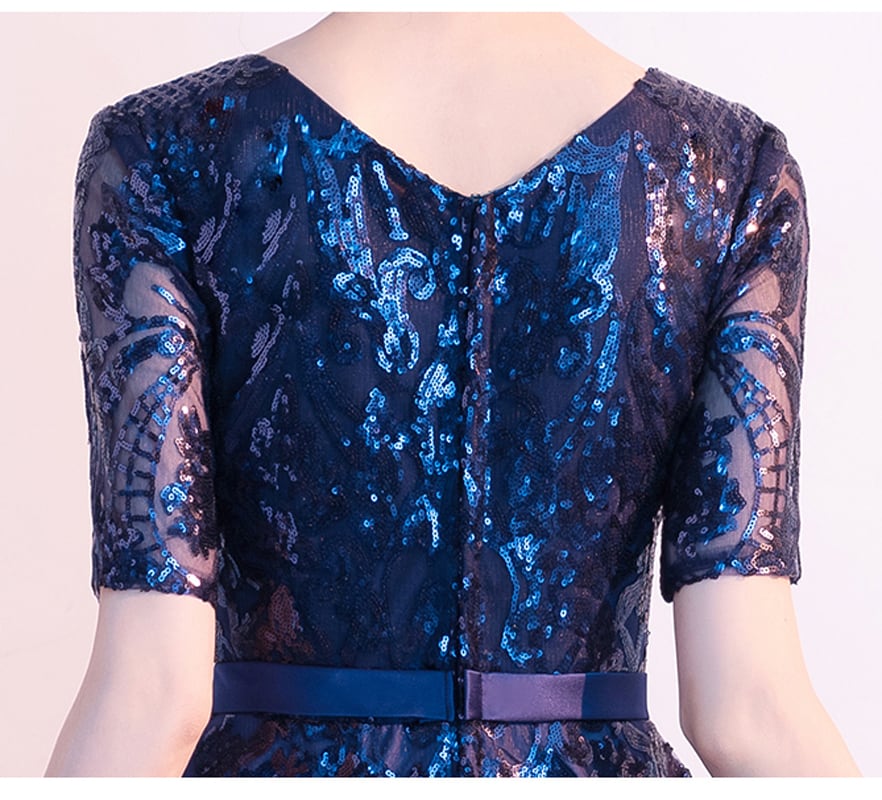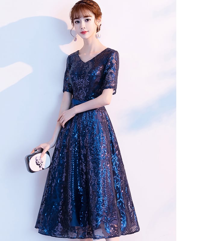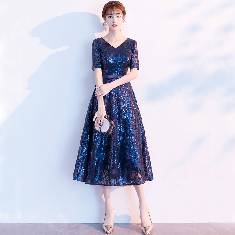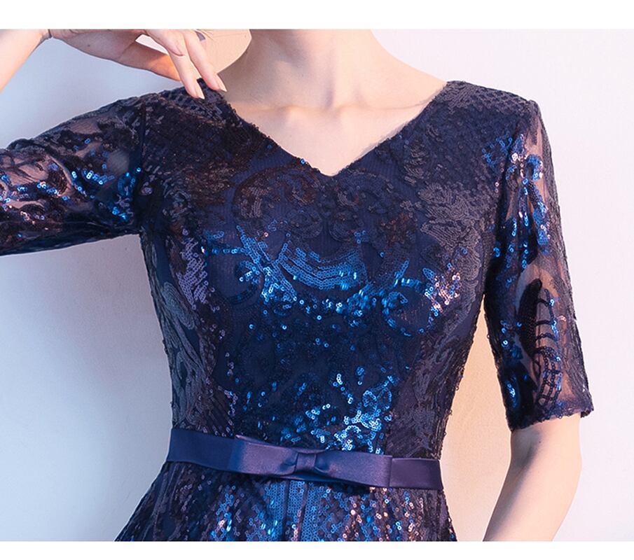 パーティードレス ワンピース ロングドレス 二次会 結婚式 演奏会 パーティー エレガント Vネック 五分袖 ロング丈 大きいサイズ XS S M L LL 3L 4L キラキラ スパンコール ネイビー