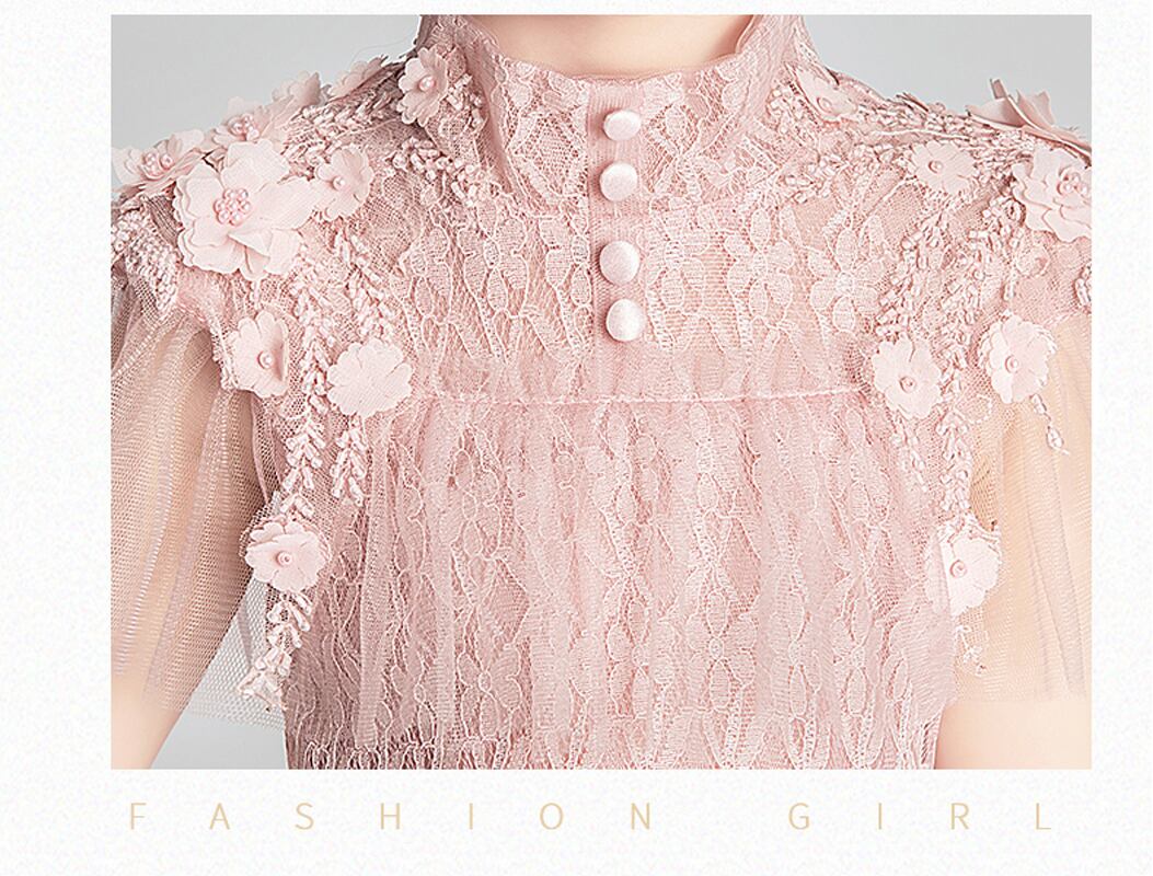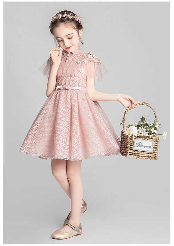 可愛い 女の子ドレス キッズドレス スタンドネック レース 立体花 フォーマル用 演奏会 結婚式 花童 卒業式 子供服 女の子 ワンピース ピンク
