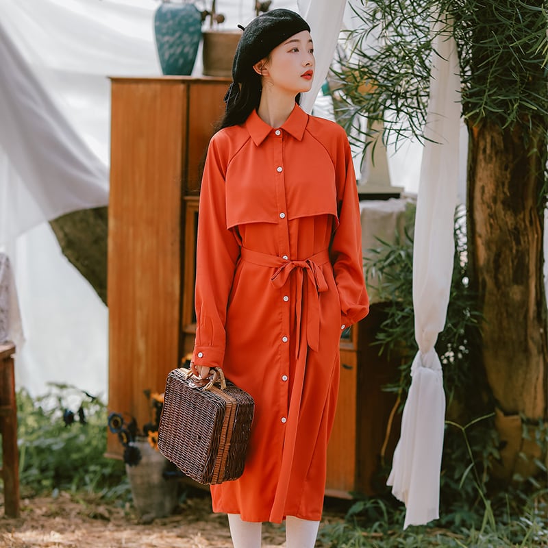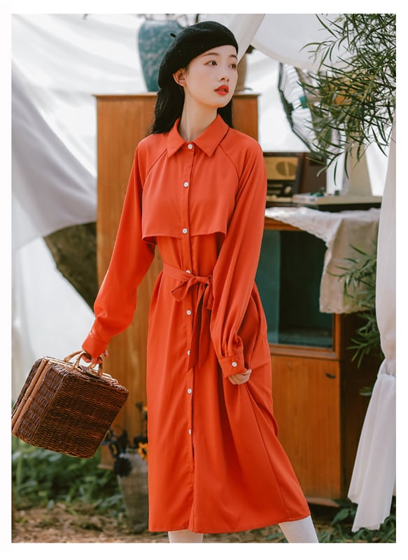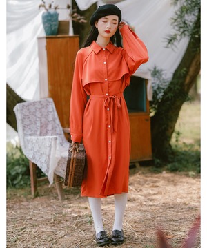 ロング丈ワンピース 可愛いワンピース レディースファション S M L 折り襟 長袖 着痩せ 合わせやすい レトロ オレンジ ベルト付き シングルブレスト