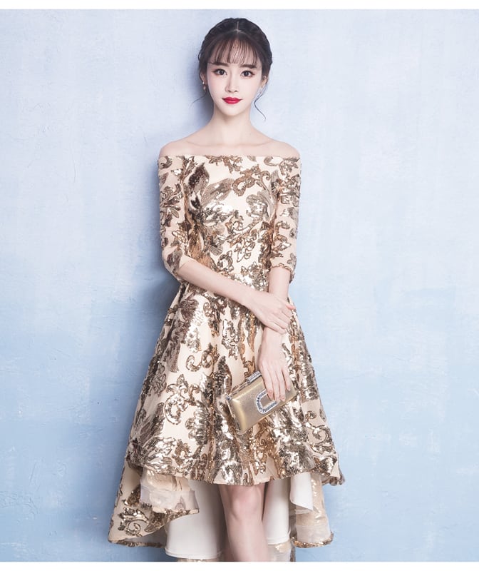 パーテイードレス ロングドレス ロングワンピース 結婚式 演奏会 二次会 ボートネック 五分袖 ハイウエスト 着痩せ エレガント 大きいサイズ XS S M L LL 3L フェアリー ゴールド