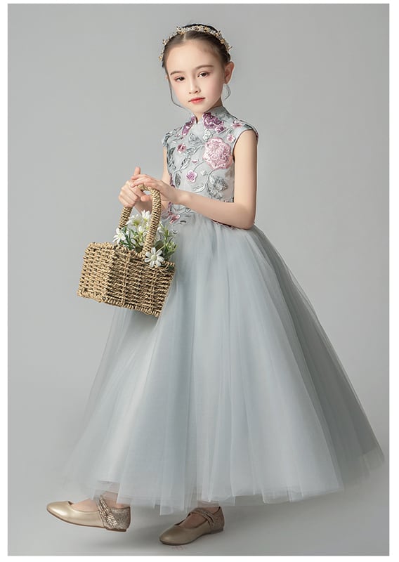 子どもドレス 子供ドレス キッズドレス ジュニア フォーマル用 ピアノ発表会 結婚式 入園式 卒業式 子供服 女の子 子供ワンピース レッド ロングドレス スタンドネック 半袖 チャイナ風 グレー 100 110 120 130 140 150 160