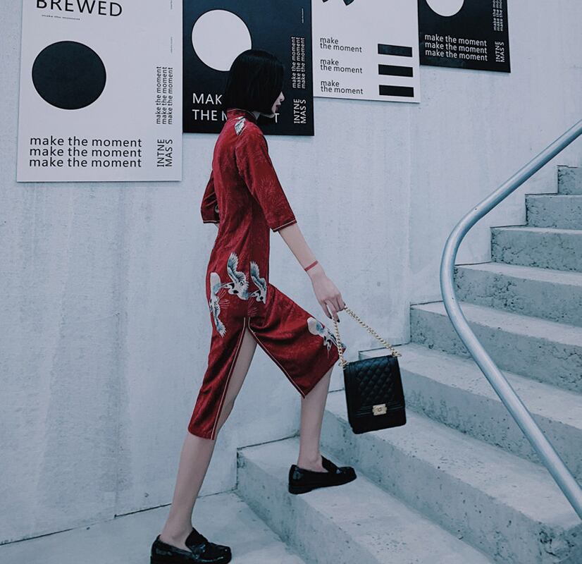ロングチャイナドレス ベルベットチャイナドレス チャイナ風ワンピース チャイナ風服 中華服 二次会 女子会 同窓会 スタンドネック 五分袖 大きいサイズ S M L LL 3L 4L 鶴模様