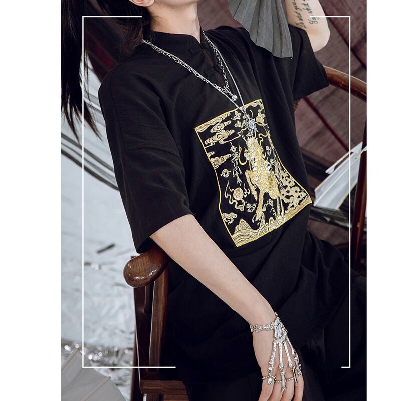【卿棠シリーズ】★チャイナ風シャツ★ 2color 黒or白 オリジナル 刺繍 棉麻 S M L XL 男女兼用 メンズ カップル服