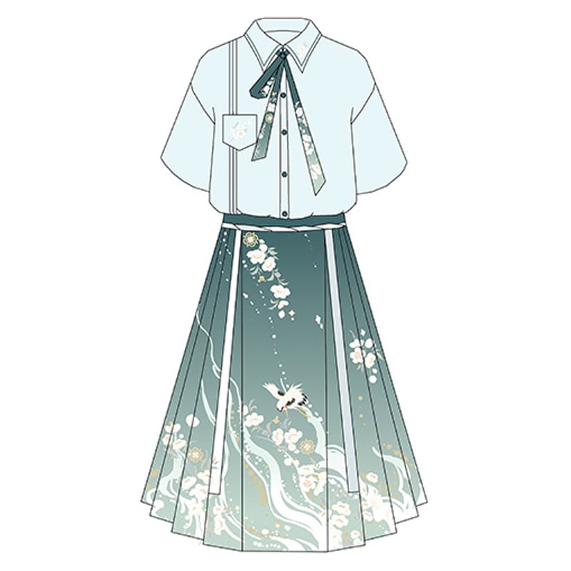 【池夏シリーズ】★チャイナ風セットアップ★ シャツ+巻きスカート 改良漢服 鶴 ブルー 青い 普段 デート 花火大会