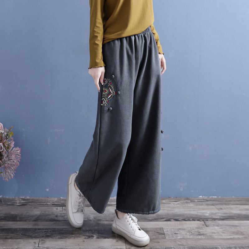 【清裊シリーズ】★チャイナ風ズボン★ 6color 裏起毛 刺繍 カジュアルパンツ ガウチョパンツ ガウチョ 黒 青 赤
