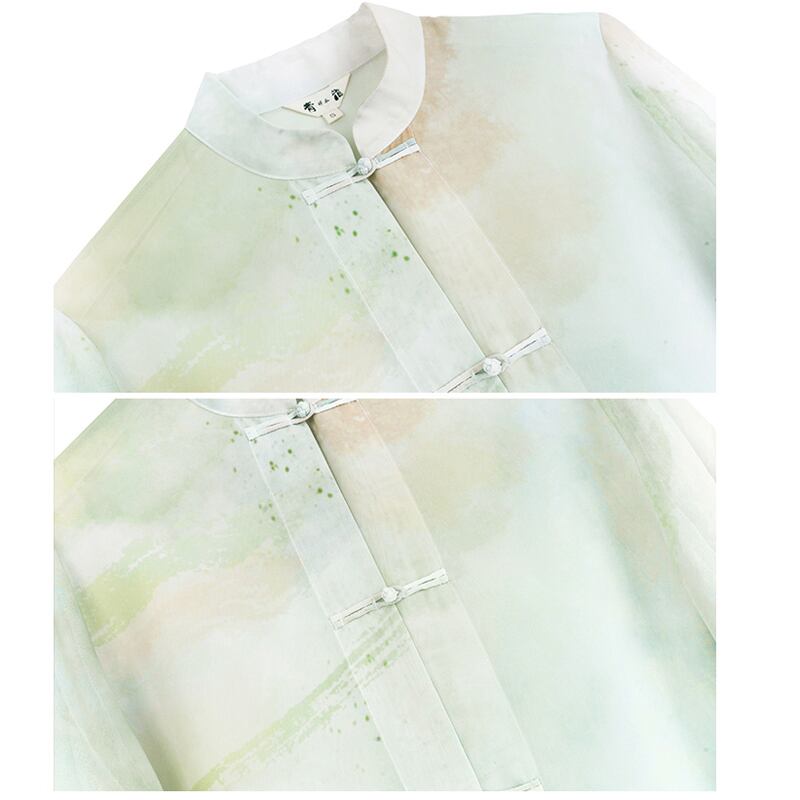 【大青龍肆シリーズ】★チャイナ風シャツ★ トップス 長袖 透け感あり シフォン プリント グリーン 緑