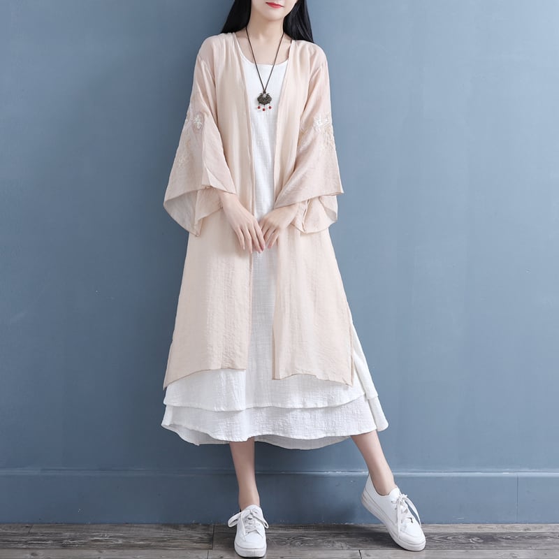 【清裊シリーズ】★チャイナ風コート★ 4カラー シフォン ロング丈 薄い スピーカースリーブ ベージュ 青緑色 パープル ホワイト