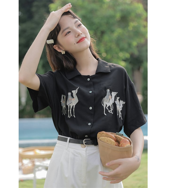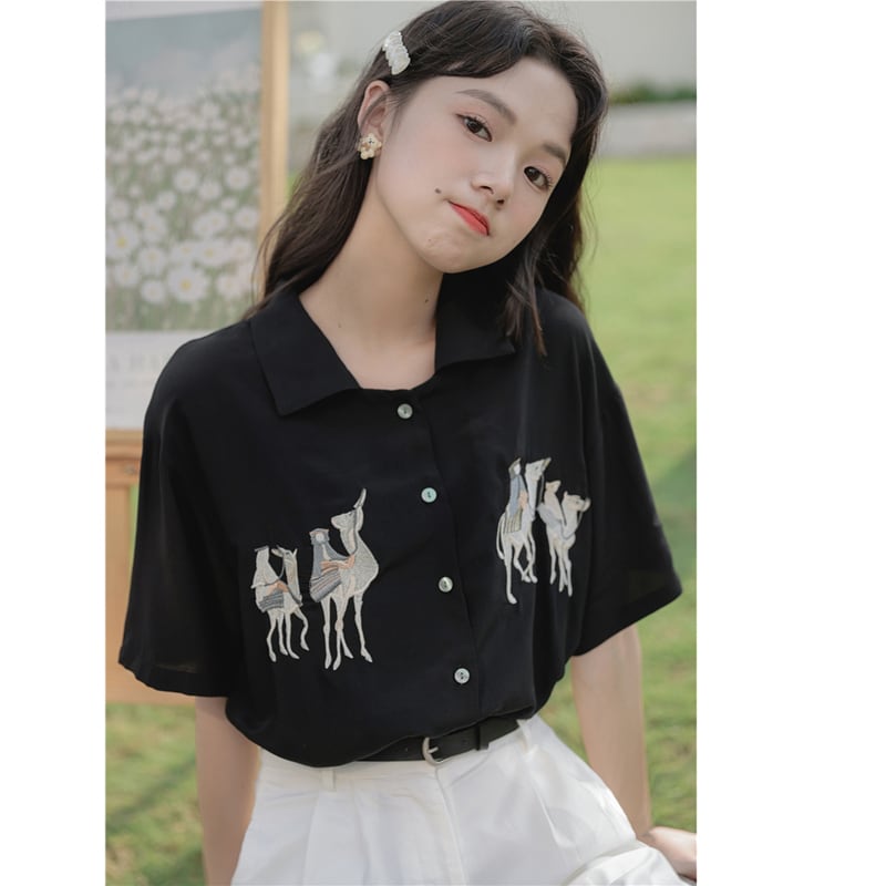 【猫姑娘シリーズ】★シャツ★ 2color トップス 刺繍 レディースファッション 動物柄 通勤 OL オフィス 白 黒