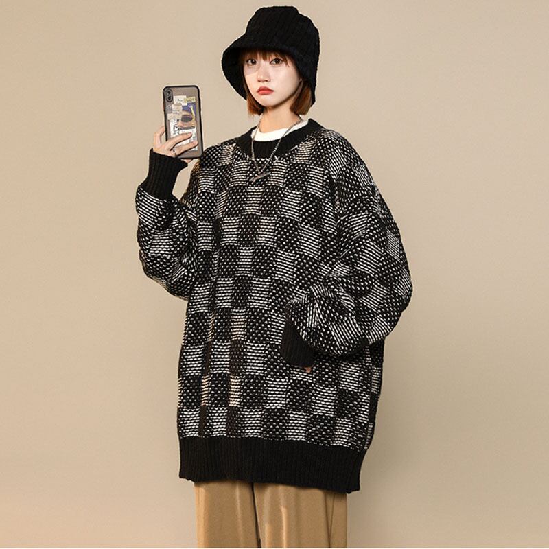 【潮美臣シリーズ】★セーター★ 3color ニットトップス 男女兼用 メンズ チェック柄 グレー グリーン ブラック