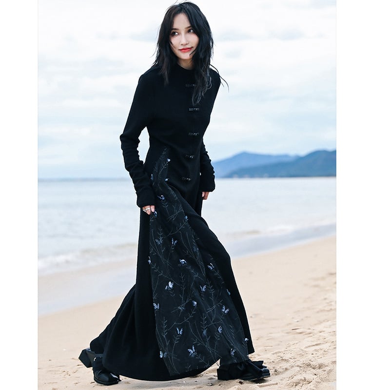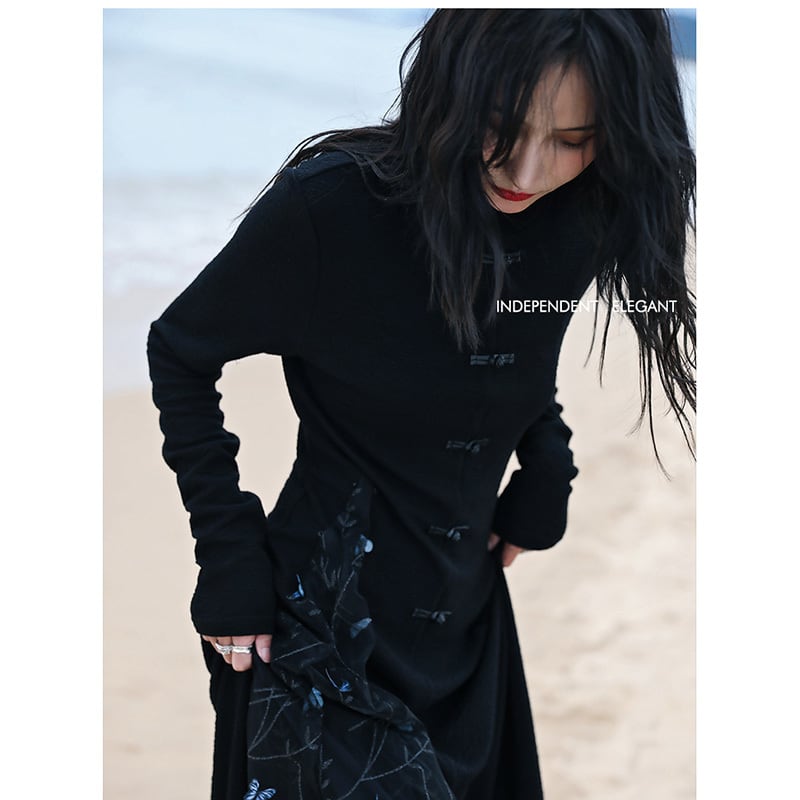✿チャイナドレスモダン!【大青龍肆シリーズ】★チャイナ風ワンピース★ ニットワンピース フェイクレイヤード 着やせ デザイン性あり