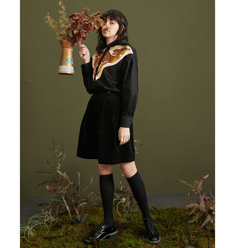 【Camoooni咖沫シリーズ】★シャツ★ 2color トップス ファッション 刺繍 鹿 グリーン ブラック コットン