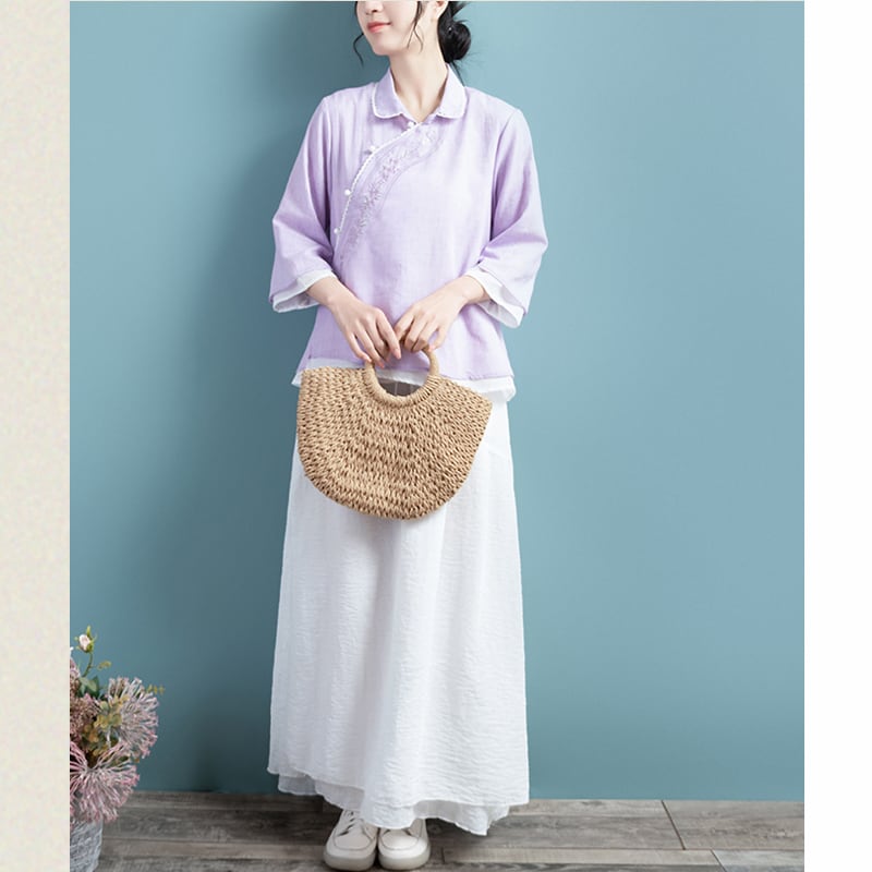 【清裊シリーズ】★チャイナ風トップス★ 5color 夏 刺繍 青緑色 グレー ホワイト パープル ピンク