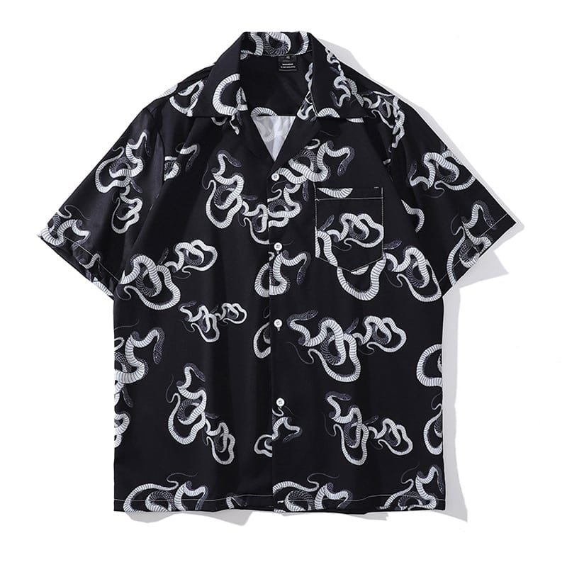 【TRAVEL ISSUANCEシリーズ】★シャツ★ 2color トップス 半袖シャツ 蛇 プリント 春夏 男女兼用 メンズ ブラック レッド