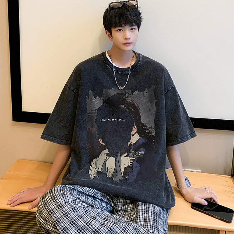 【Lettheheartシリーズ】★トップス★ Tシャツ 男女兼用 メンズ 大きいサイズ レトロ 個性的 黒灰色 合わせやすい
