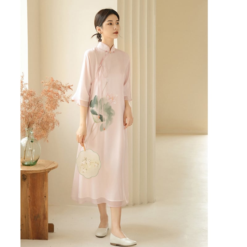 【拾夢シリーズ】★チャイナ風ワンピース★ エレガント 中華服 唐装 レトロ プリント 夏服 蓮 ピンク