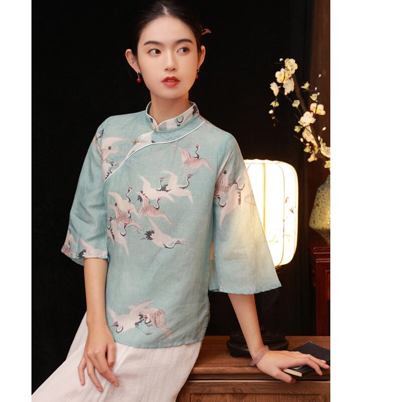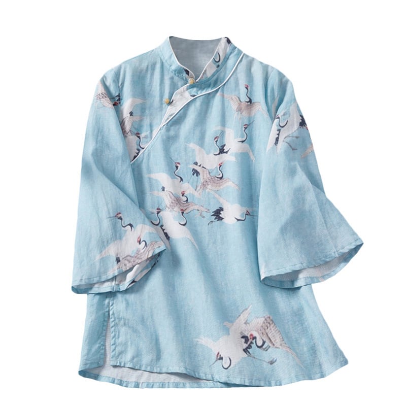 【FEXIAOYUANシリーズ】★チャイナ風トップス★ シャツ 気質アップ 改良唐装 薄い 民国風 ブルー 青い 鶴 つる