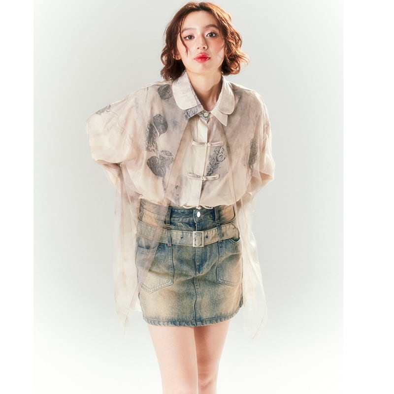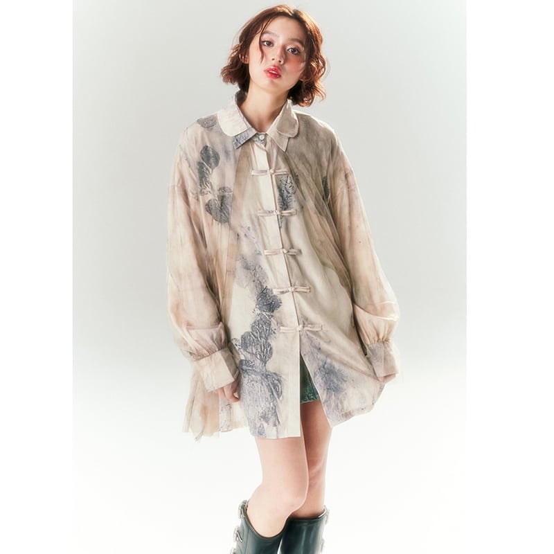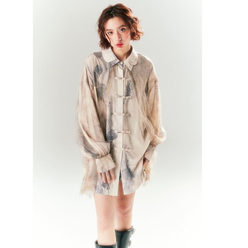 【楊二大夢シリーズ】★チャイナ風シャツ★ トップス プリント チャイナボタン 長袖シャツ レトロ