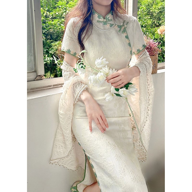 【ZHUDIMEIシリーズ】★チャイナ風ワンピース★ 改良型チャイナドレス エレガント 半袖 花柄 ベージュ 着痩せ