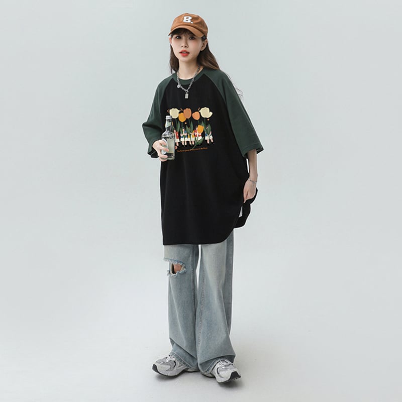 【藤伊曼シリーズ】★Tシャツ★ 3color トップス 男女兼用 メンズ 配色 花 カジュアル 合わせやすい