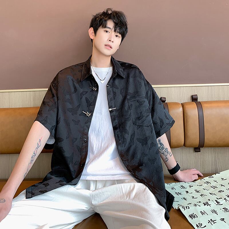 【NANSHIシリーズ】★シャツ★ 2color トップス 男女兼用 メンズ 蝶々 プリント 半袖シャツ ブラック ホワイト