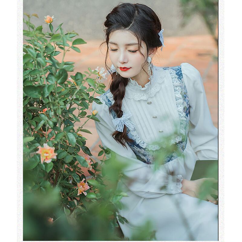 【南柯夢シリーズ】★ワンピース★ 切り替え 油絵風 レトロ フェイクレイヤード 可愛い デート 青 ブルー