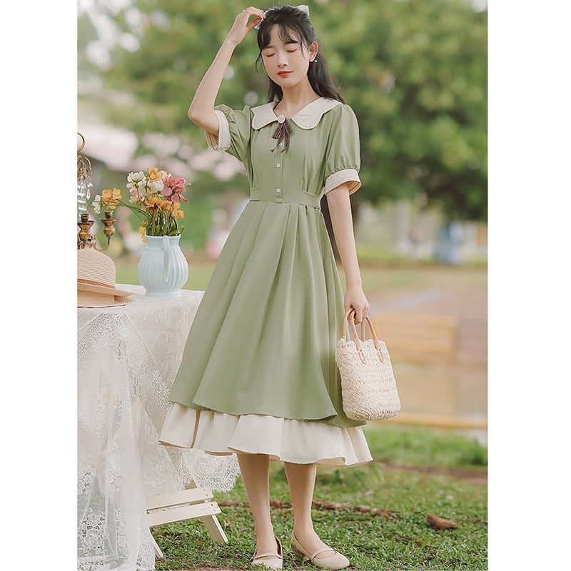 【書槿笙シリーズ】★ワンピース★ 2color 半袖 文芸スタイル 可愛い デート グリーンパープル 可愛い