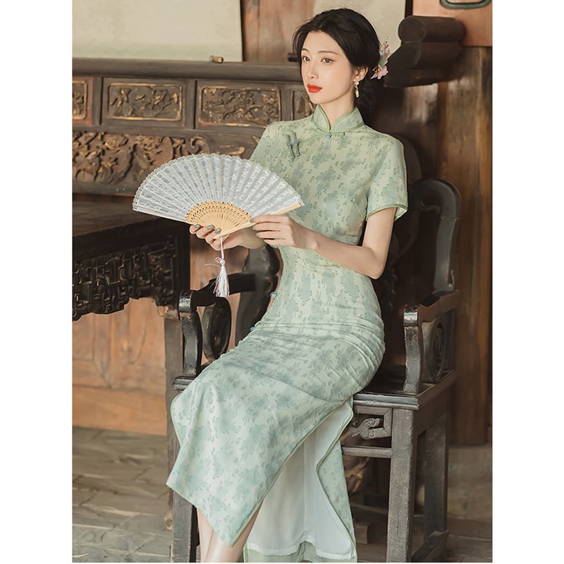 【Queenシリーズ】★チャイナ風ワンピース★ 改良型チャイナドレス 気質アップ 半袖 緑 グリーン S M L XL