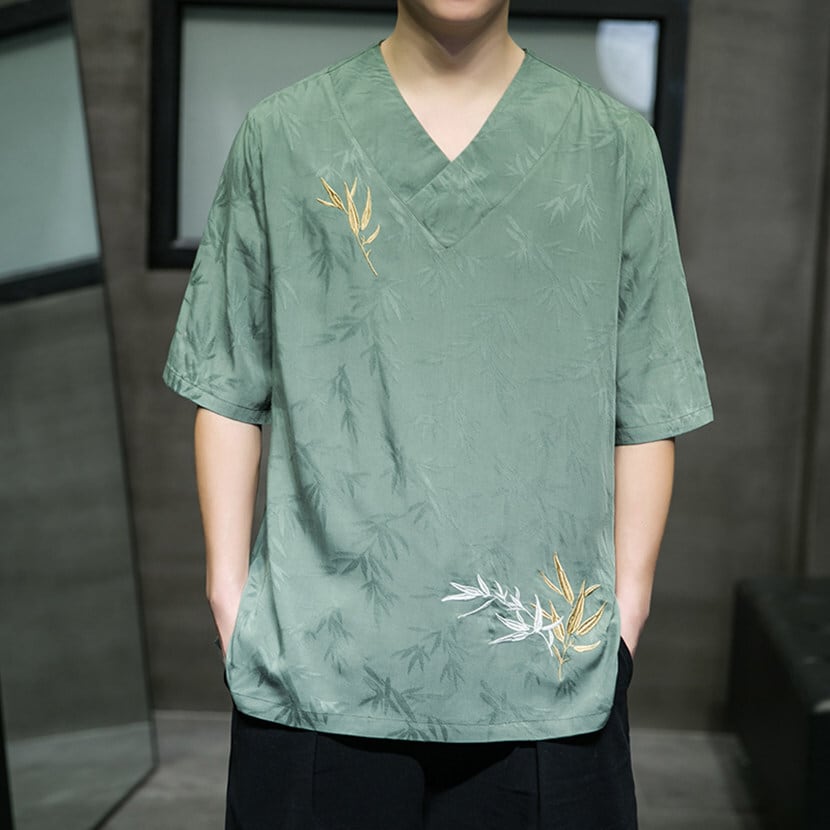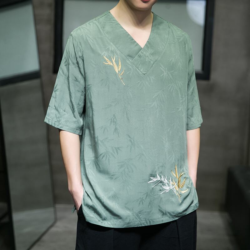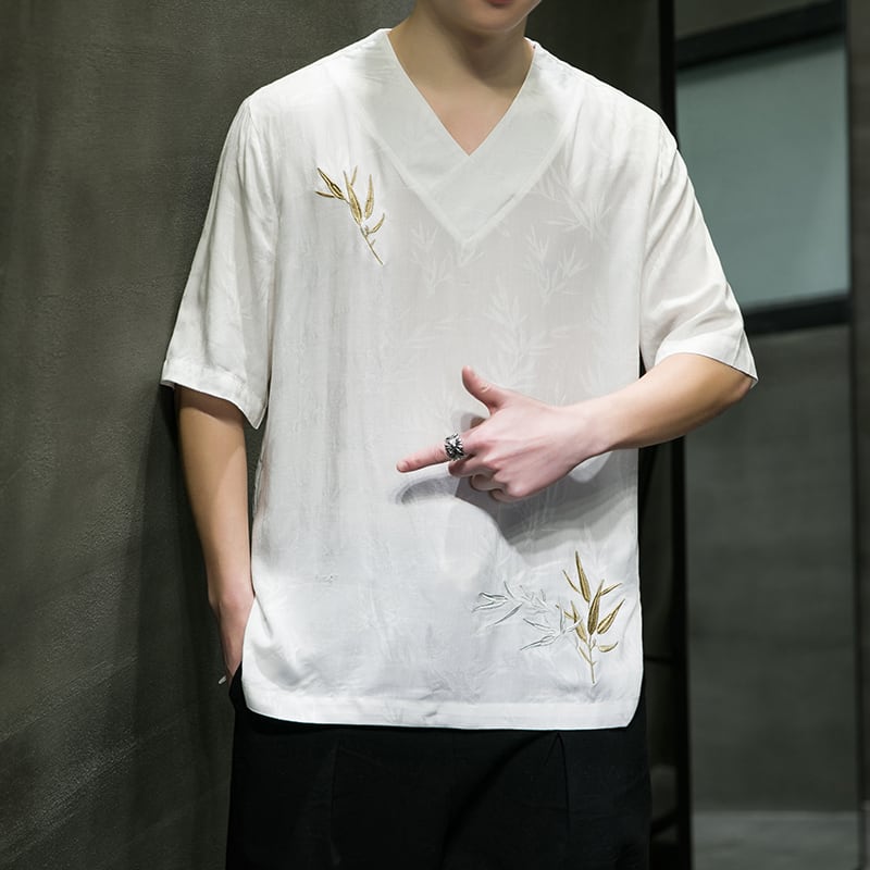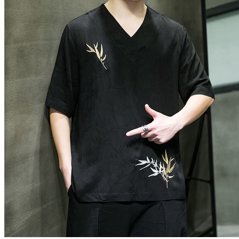 【JIARONGシリーズ】★チャイナ風Tシャツ★ 刺繍 トップス 3color 男女兼用 メンズ 大きいサイズ 薄い vネック