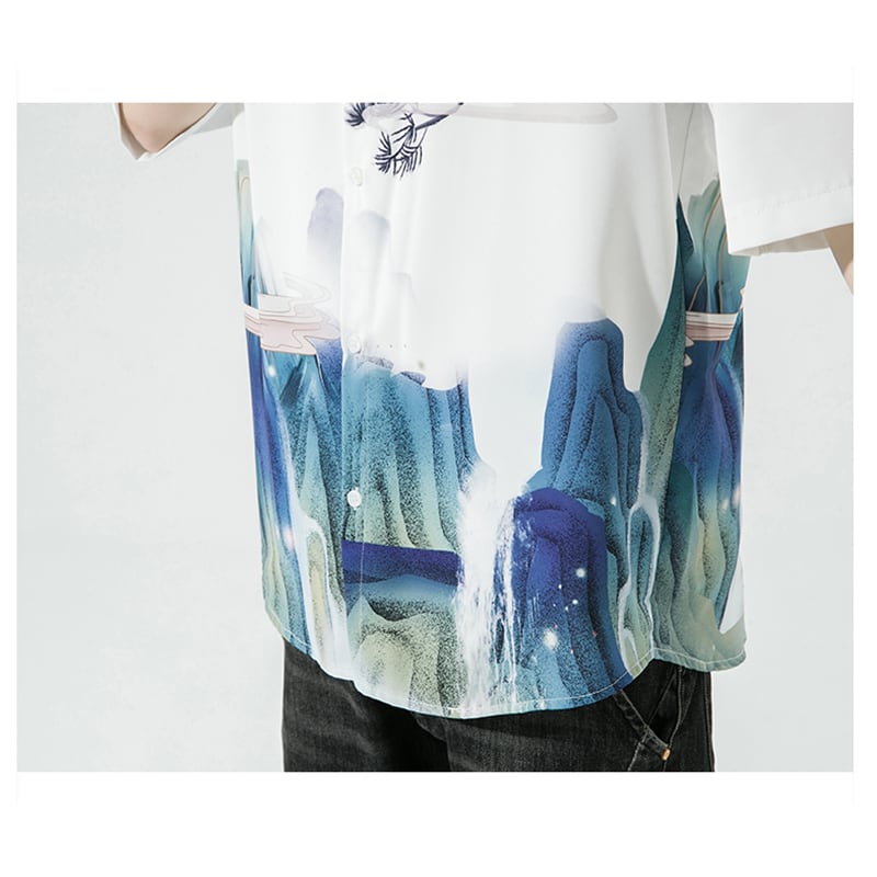 【MOWENZHAIシリーズ】★チャイナ風シャツ★ 水墨柄 鶴 半袖シャツ トップス 男女兼用 メンズ 大きいサイズ