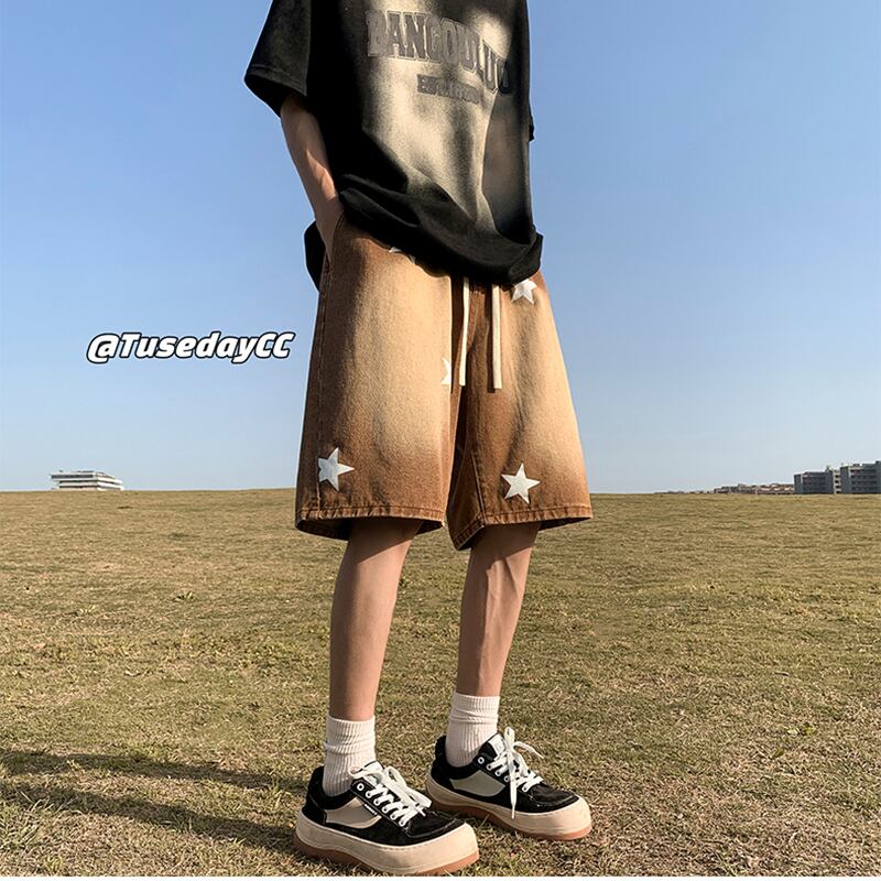 【NANSHIシリーズ】★短パン★ デニムパンツ 2color カジュアル 男女兼用 メンズ シンプル 星 夏服 ブラック ブラウン
