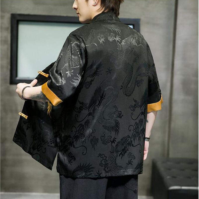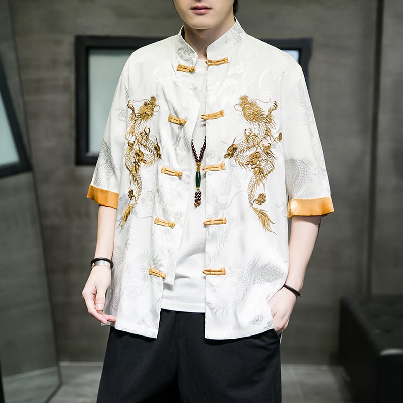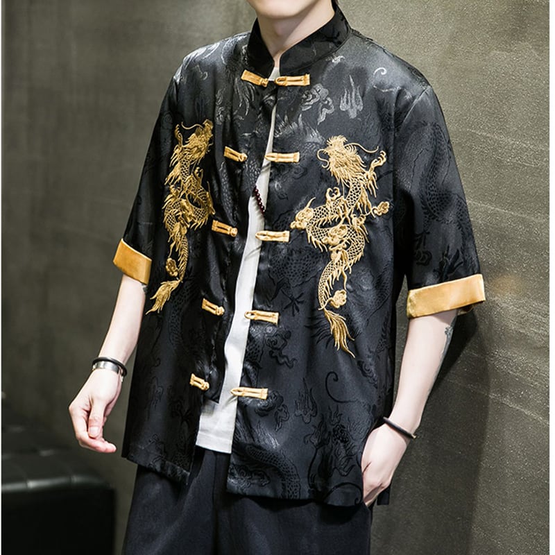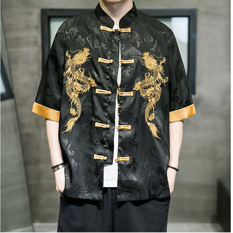 【JUNYIシリーズ】★チャイナ風シャツ★ 刺繍 龍 2color 男女兼用 メンズ 大きいサイズ 中華服 黒 白