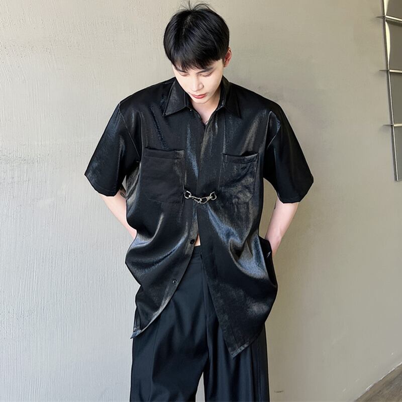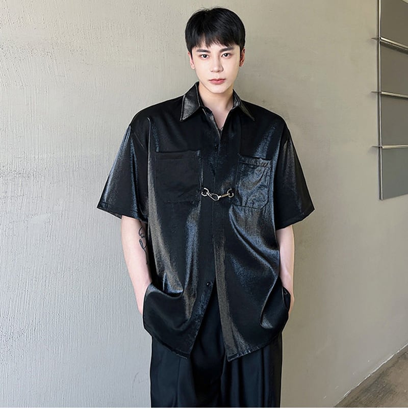 【入画シリーズ】★チャイナ風シャツ★ 2color トップス 艶有り 光沢感 ファッション 男女兼用 メンズ 白 黒