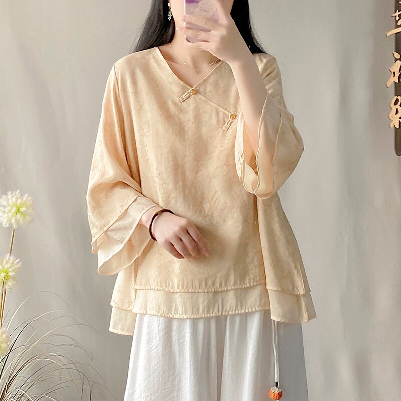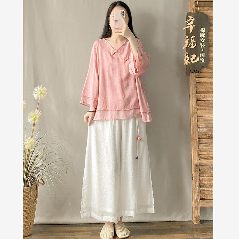 【幸福紀シリーズ】★チャイナ風シャツ★ 3color Vネック トップス 民族風 グリーン イエロー ピンク