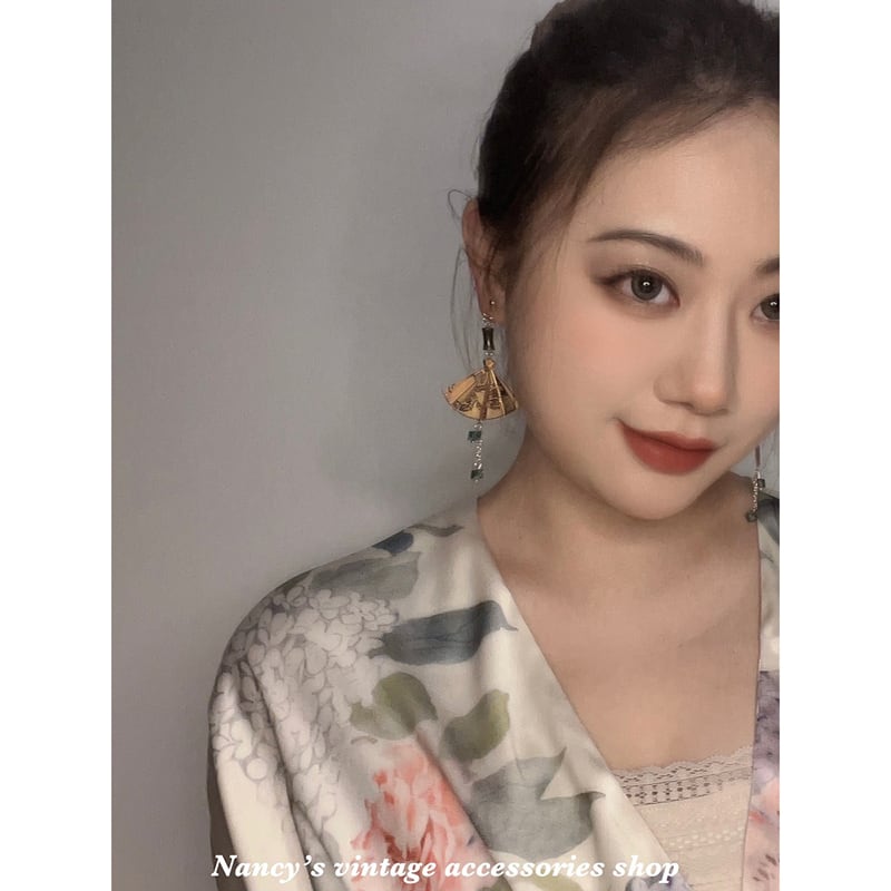 【南小姐シリーズ】★チャイナ風耳飾り★ レトロ ペア ピアスorイヤリング 扇子 竹 緑 グリーン ゴールド 気質アップ