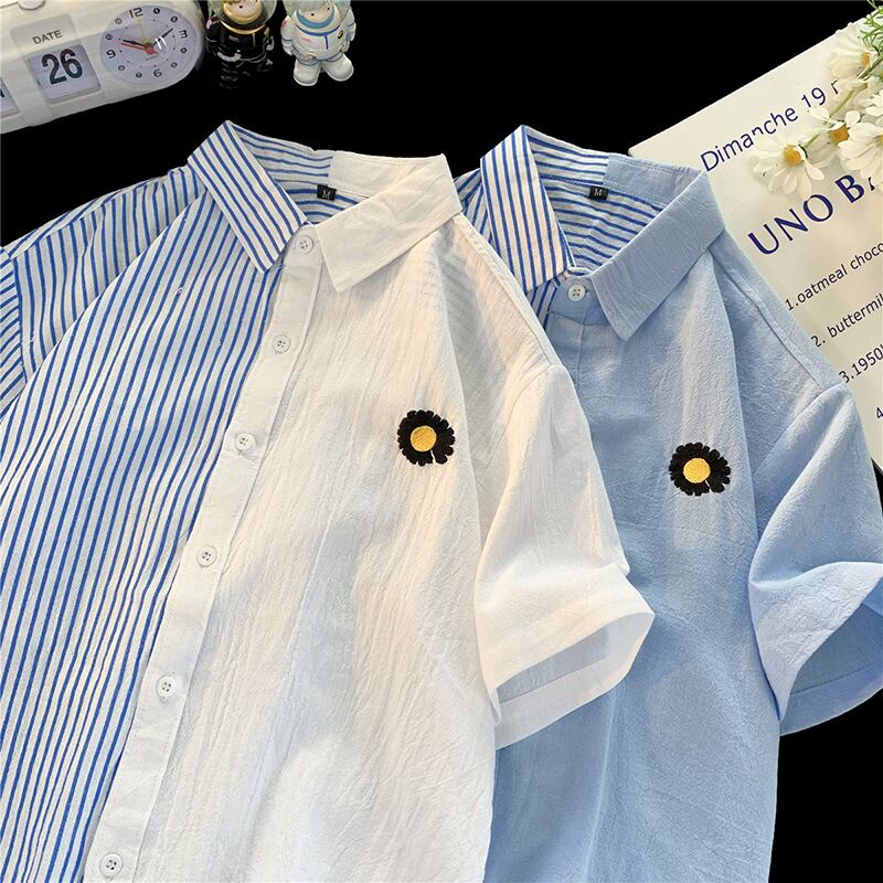 【藤伊曼シリーズ】★シャツ★ 2color トップス 半袖シャツ 男女兼用 メンズ 縦縞 縞模様 青 白 S M L XL 2XL 3XL