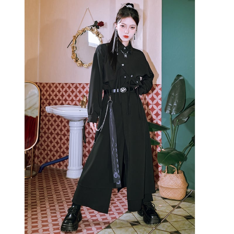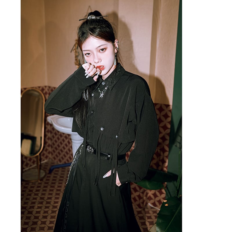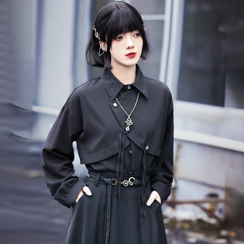 【古怪舍---金烏シリーズ】★チャイナ風シャツ★ トップス 不規則 刺繍 オリジナル フェイクレイヤード ブラック 黒