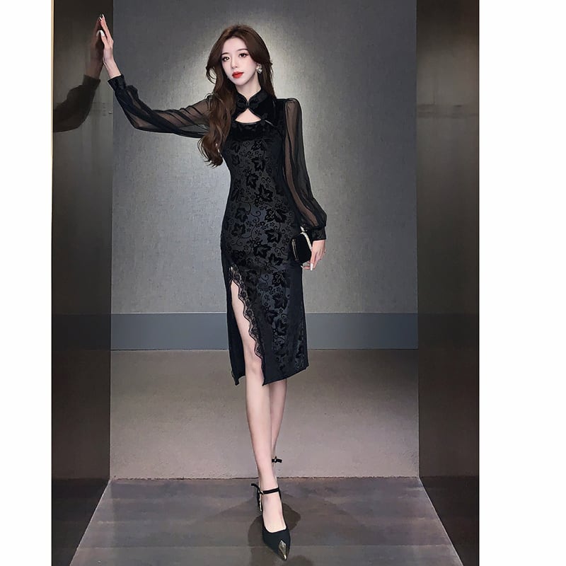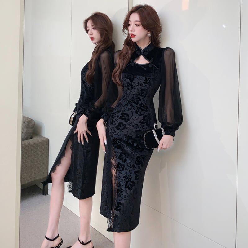 【百分之八シリーズ】★チャイナドレス★ ベルベット 切り替え 花柄 着痩せ セクシー ブラック 黒い S M L XL