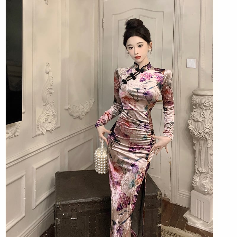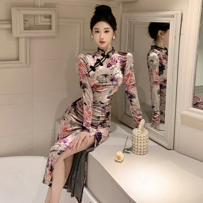 【百分之八シリーズ】★花柄チャイナドレス★ ベルベット 着痩せ セクシー S M L 合わせやすい 気質アップ