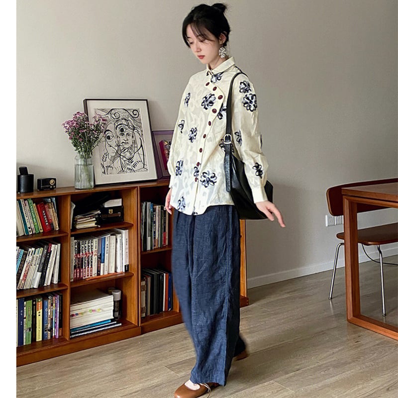 【Sunnyシリーズ】★チャイナ風トップス★ 長袖シャツ 花柄シャツ 気質アップ レディース ゆったり 合わせやすい