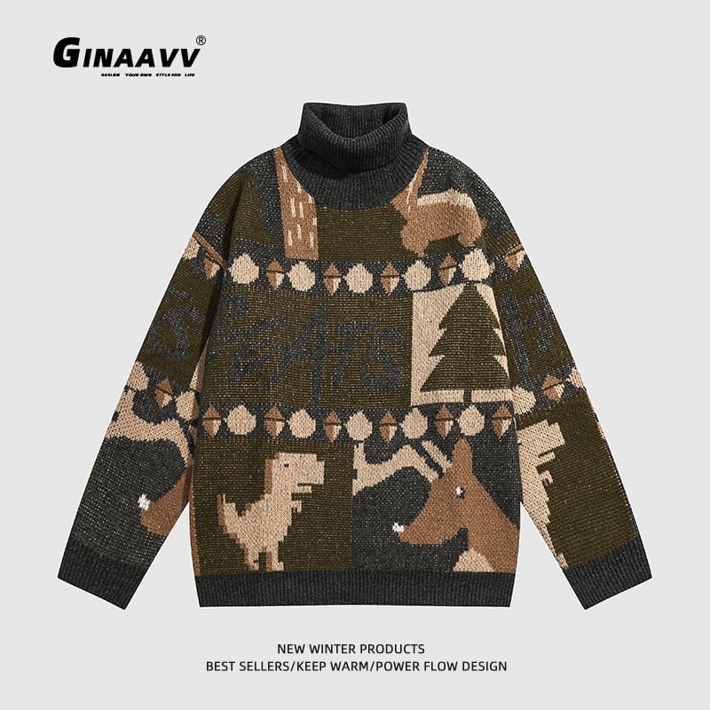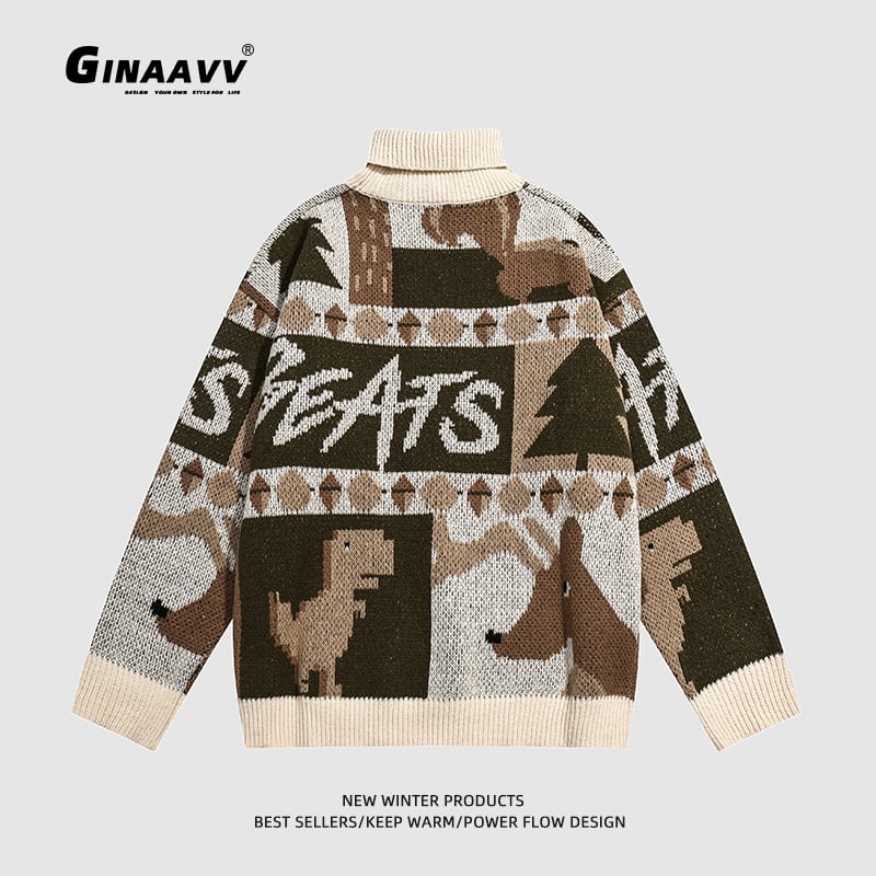 【Ginaavvシリーズ】★セーター★ ニットトップス ハイネック カートゥーン 恐竜 男女兼用 メンズ カジュアル M L XL 2XL