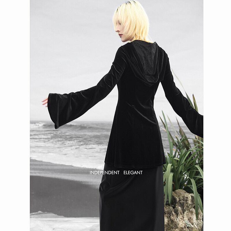【大青龍肆シリーズ】★チャイナ風トップス★ パーカー ベルベット 十字架 ブラック スリット