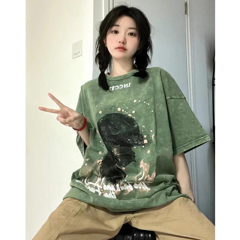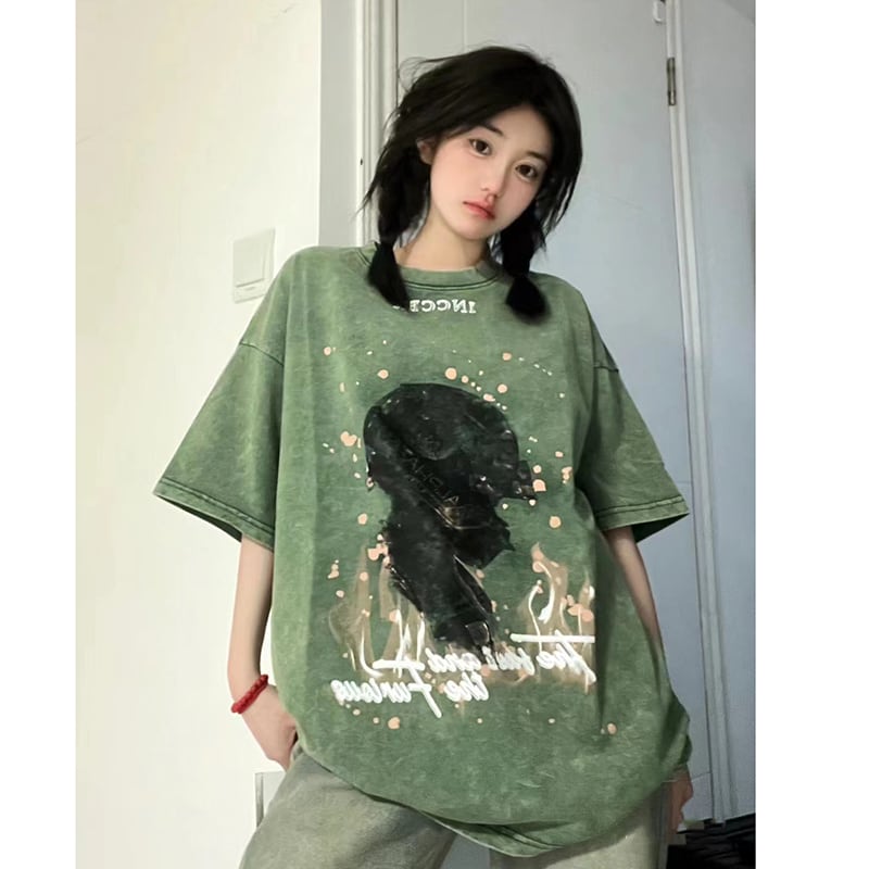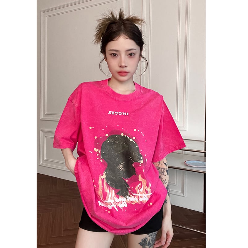 【FEIYUANSHENシリーズ】★Tシャツ★ 4color トップス 半袖 男女兼用 メンズ レトロ ブラック グリーン パープル ピンク