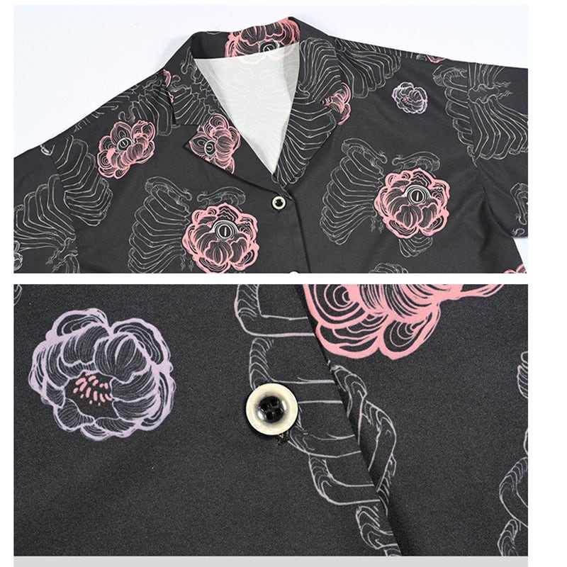【古怪舍---花骨シリーズ】★チャイナ風トップス★ 2color 半袖トップス 半袖シャツ プリント 個性的 オリジナル ブラック ホワイト