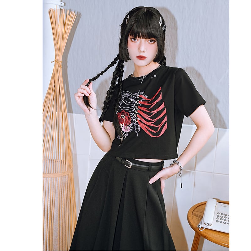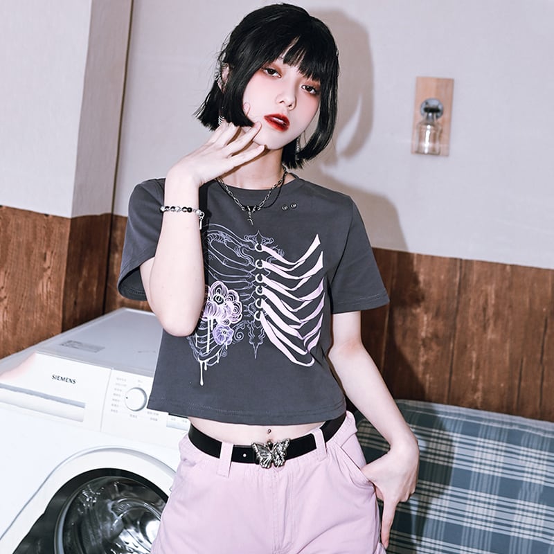 ✿人気商品再入荷✿【古怪舍---花骨シリーズ】★チャイナ風トップス★ 2color 半袖 Tシャツ プリント 個性的 オリジナル レディース 黒 赤 灰