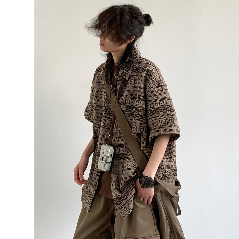【JIWUシリーズ】★シャツ★ トップス アウター 半袖 レトロ エスニック風 男女兼用 メンズ カジュアル ブラウン