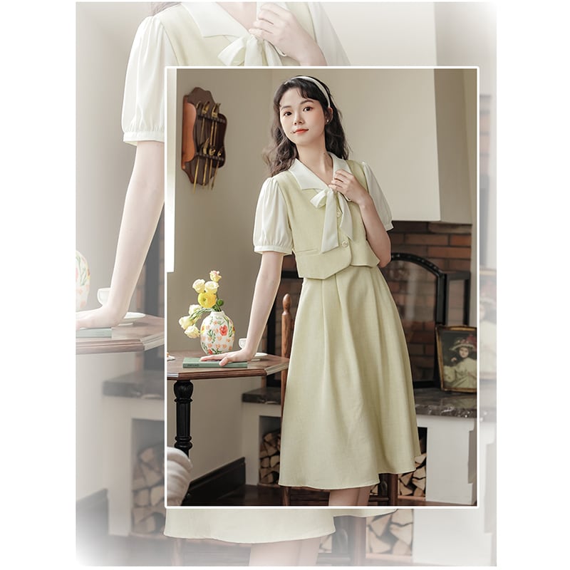 【LAWOシリーズ】★ワンピース★ フェイクレイヤード リボン 可愛い レディース 気質アップ デート 通勤